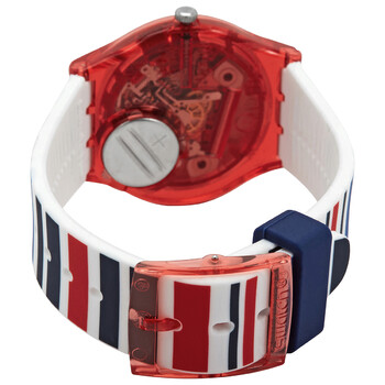 Red plastic case with a red, white, blue and navy stripe silicone strap. Fixed red plastic bezel. White dial with black hands and index hour markers. Arabic numerals appear at the 6, 9 and 12 o'clock positions. Dial Type: Analog. Day of the week and date display at the 3 o'clock position. Quartz movement. Plexiglass crystal. Pull / push crown. Translucent case back. Round case shape. Case size: 34 mm. Case thickness: 8.75 mm. Band width: 16 mm. Tang clasp. Water resistant at 30 meters / 100 feet. Functions: date, day, hour, minute, second. Sea Barcode Series. Casual watch style. Watch label: Swiss Made. Swatch Sea Barcode Quartz White Dial Unisex Watch GR712.