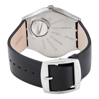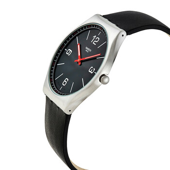 Stainless steel case with a black leather strap. Fixed stainless steel bezel. Black dial with luminous red hands and index hour markers. Arabic numerals mark the 3, 6, 9 and 12 o'clock positions. Minute markers around the outer rim. Dial Type: Analog. Luminescent hands. Quartz movement. Plexiglass crystal. Pull / push crown. Solid case back. Round case shape. Case size: 42 mm. Case thickness: 6 mm. Band width: 19 mm. Tang clasp. Water resistant at 30 meters / 100 feet. Functions: hour, minute. Casual watch style. Watch label: Swiss Made. Swatch SKINBLACK Quartz Black Dial Men's Watch SS07S100.