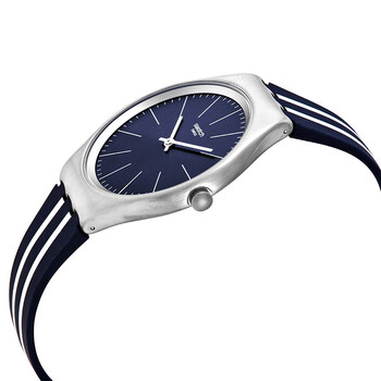 Silver-tone stainless steel case with a two-tone (blue and white) silicone strap. Fixed silver-tone stainless steel bezel. Blue dial with silver-tone hands and index hour markers. Minute markers around the outer rim. Dial Type: Analog. Quartz movement. Scratch resistant mineral crystal. Pull / push crown. Solid case back. Round case shape, case size: 38 mm, case thickness: 5.80 mm. Buckle clasp. Water resistant at 30 meters / 100 feet. Functions: hour, minute. Casual watch style. Watch label: Swiss Made. Swatch Skinblueiron Quartz Blue Dial Men's Watch SYXS106.