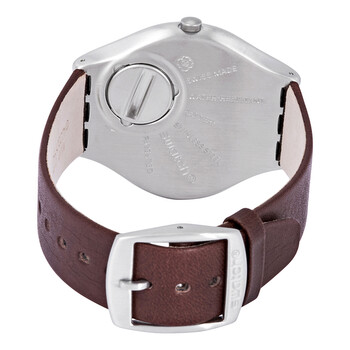 Stainless steel case with a brown leather strap. Fixed stainless steel bezel. Black dial with luminous silver-tone hands and Arabic numeral hour markers. Minute markers. Dial Type: Analog. Quartz movement. Scratch resistant mineral crystal. Pull / push crown. Solid case back. Round case shape. Case size: 38 mm. Case thickness: 5.80 mm. Band width: 19 mm. Tang clasp. Water resistant at 30 meters / 100 feet. Functions: hour, minute. Casual watch style. Swatch Skinbrushed Black Dial Brown Leather Men's Watch SYXS102.