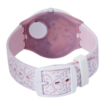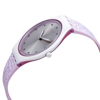 White plastic case with a light pink design silicone strap. Fixed white plastic bezel. Silver dial with silver-tone hands and dot hour markers. Dial Type: Analog. Quartz movement. Plexiglass crystal. Pull / push crown. Solid case back. Round case shape. Case size: 36.8 mm. Case thickness: 5.4 mm. Band width: 19 mm. Tang clasp. Water resistant at 30 meters / 100 feet. Functions: hour, minute. Casual watch style. Watch label: Swiss Made. Swatch Skindentelle Silver Dial Ladies Watch SVOW102.