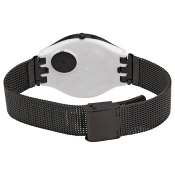Black plastic case with a black metal mesh bracelet. Fixed silver-tone bezel. Black dial with silver-tone hands and index hour markers. Arabic numeral minute markers (at 5 minute intervals). Dial Type: Analog. Quartz movement. Scratch resistant plexiglass crystal. Pull / push crown. Solid case back. Round case shape. Case size: 36 mm. Case thickness: 6 mm. Band width: 20 mm. Fold over slip through clasp. Water resistant at 30 meters / 100 feet. Functions: hour, minute. Fashion watch style. Swatch Skinotte Quartz Black Dial Ladies Watch SVOB100M.