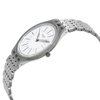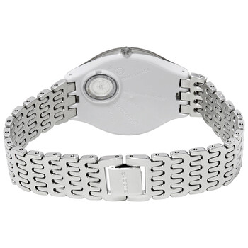 Silver plastic case with a stainless steel bracelet. Fixed silver plastic bezel. White dial with silver-tone hands and index hour markers. Dial Type: Analog. Quartz movement. Pull / push crown. Solid case back. Round case shape. Case size: 36.8 mm. Case thickness: 5.4 mm. Band width: 18 mm. Jewelry clasp. Water resistant at 30 meters / 100 feet. Functions: hour, minute. Skinparure Series. Casual watch style. Watch label: Swiss Made. Swatch Skinparure White Dial Men's Watch SVOM104G.