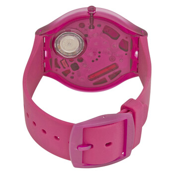 Translucent purple plastic case with a purple silicone strap. Fixed purple plastic bezel. Purple dial with luminous silver-tone hands and index hour markers. Dial Type: Analog. Luminescent hands. Quartz movement. Plexiglass crystal. Pull / push crown. Purple translucent case back. Round case shape. Case size: 40 mm. Case thickness: 5.65 mm. Band width: 18 mm. Tang clasp. Water resistant at 30 meters / 100 feet. Functions: hour, minute. Casual watch style. Swatch Skinromance Purple Dial Ladies Watch SVUV100.