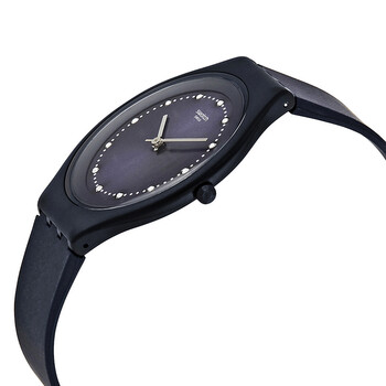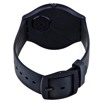 Dark blue plastic case with a dark blue silicone strap. Fixed dark blue plastic bezel. Dark blue sun-brushed dial with silver-tone hands and dot hour markers. Minute markers around the outer rim. Dial Type: Analog. Quartz movement. Plexiglass crystal. Pull / push crown. Solid case back. Round case shape. Case size: 40 mm. Case thickness: 5.65 mm. Band width: 18 mm. Tang clasp. Water resistant at 30 meters / 100 feet. Functions: hour, minute. Casual watch style. Swatch Skinsparks Dark Blue Sun-brushed Dial Unisex Watch SVUN100.