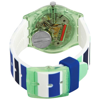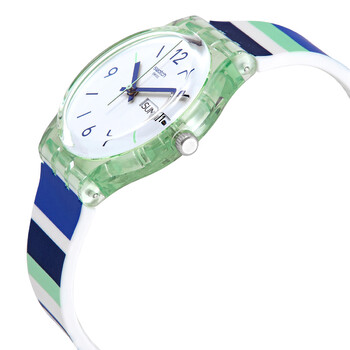 Green plastic case with a blue, green and white stripe silicone strap. Fixed green plastic bezel. White dial with blue hands and index hour markers. Arabic numerals appear at the 6, 9 and 12 o'clock positions. Dial Type: Analog. Day of the week and date display at the 3 o'clock position. Quartz movement. Plexiglass crystal. Pull / push crown. Translucent case back. Round case shape. Case size: 34 mm. Case thickness: 8.75 mm. Band width: 16 mm. Tang clasp. Water resistant at 30 meters / 100 feet. Functions: date, day, hour, minute, second. Sky Zebra Series. Casual watch style. Watch label: Swiss Made. Swatch Sky Zebra Quartz White Dial Watch GG711.