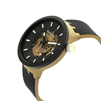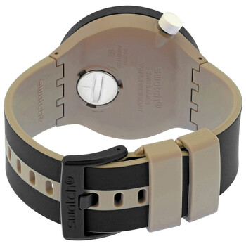 Black bioceramic case with a black/taupe silicone strap. Fixed black bioceramic bezel. Black dial with black hands and index hour markers. Dial Type: Analog. Luminescent hands and markers. Quartz movement. Solid case back. Round case shape, case size: 47 mm, case thickness: 11.75 mm. Buckle clasp. Water resistant at 30 meters / 100 feet. Functions: hour, minute, second. The September Collection Series. Swatch The September Collection Time For Taupe Quartz Black Dial Watch Sb03c100.