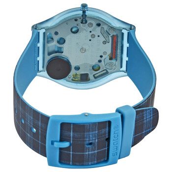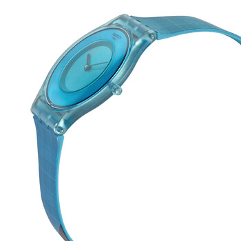 Blue (translucent) bio-sourced material case with a blue silicone strap. Fixed blue (translucent) bio-sourced material bezel. Blue dial with black hands. No markers. Dial Type: Analog. Quartz movement. Pull / push crown. Solid case back. Round case shape. Case size: 34 mm. Case thickness: 5.4 mm. Band width: 17.6 mm. Tang clasp. Water resistant at 30 meters / 100 feet. Functions: hour, minute. Swatch X Supriya Lele Series. Casual watch style. Swatch X Supriya Lele Quartz Blue Dial Ladies Watch SS08Z102.
