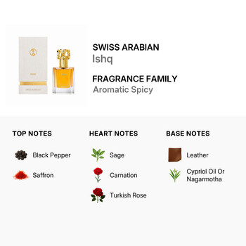 Crafted by the renowned design house of Swiss Arabian, Ishq is an Eau de Parfum spray that offers long-lasting wear and a sophisticated aroma. The 1.7 oz bottle is perfect for daily use or special occasions, making it a must-have addition to any fragrance collection. Whether you're heading to an important meeting or a night out, this scent enhances your presence with its bold and refined character.