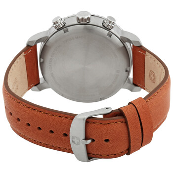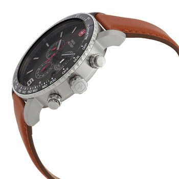 Silver-tone stainless steel case with a brown leather strap. Uni-directional rotating black stainless steel bezel. Black dial with black hands and index hour markers. Minute markers around the outer rim. Dial Type: Analog. Luminescent hands and markers. Date display at the 4 o'clock position. Chronograph - three sub-dials displaying: 60 second, 30 minute and 12 hours. Ronda Caliber 515 quartz movement. Scratch resistant sapphire crystal. Pull / push crown. Solid case back. Round case shape, case size: 44 mm. Water resistant at 100 meters / 330 feet. Functions: date, hour, minute, second. Roadster Black Night Series. Military watch style. Watch label: Swiss Movt. Swiss Military Roadster Black Night Quartz Black Dial Men's Watch 01.1843.304.