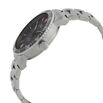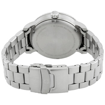 Silver-tone stainless steel case and bracelet. Uni-directional rotating black stainless steel bezel. Black dial with silver-tone hands and index hour markers. Minute markers around the outer rim. Dial Type: Analog. Luminescent hands and markers. Date display at the 3 o'clock position. Ronda Caliber 515 quartz movement. Scratch resistant sapphire crystal. Screw down crown. Solid case back. Round case shape, case size: 44 mm. Deployment with push button release clasp. Water resistant at 100 meters / 330 feet. Functions: date, hour, minute, second. Roadster Series. Military watch style. Watch label: Swiss Movt. Swiss Military Roadster Quartz Black Dial Men's Watch 01.1841.304.