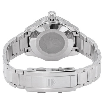 Stainless steel case with a stainless steel bracelet. Uni-directional rotating stainless steel bezel with an inlaid black ceramic ring. Black dial with luminous silver-tone hands and dot hour markers. Minute markers around the outer rim. Dial Type: Analog. Luminescent hands and markers. Date display at the 6 o'clock position. TAG Heuer calibre 5 automatic movement, based upon ETA 2824-2, containing 26 Jewels, bitting at 28800 vph, and has a power reserve of approximately 38 hours. Scratch resistant sapphire crystal. Screw down crown. Solid case back. Dodecagon case shape. Case size: 36 mm. Fold over clasp with a push button release. Water resistant at 300 meters / 1000 feet. Functions: date, hour, minute, second. Aquaracer Series. Dive watch style. Watch label: Swiss Made. Tag Heuer Aquaracer Automatic Black Dial Ladies Watch WBP231D.BA0626.