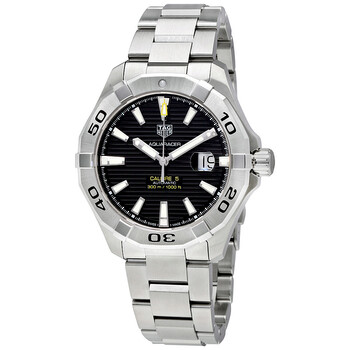 Stainless steel case with a stainless steel bracelet. Uni-directional rotating stainless steel bezel. Black dial with luminous silver-tone hands and index hour markers. Minute markers around the outer rim. Luminescent hands and markers. Date display at the 3 o'clock position. Tag Heuer caliber 5 automatic movement with a 38-hour power reserve. Scratch resistant sapphire crystal. Screw down crown. Solid case back. Case size: 43 mm. Case thickness: 12 mm. Dodecagon case shape. Bracelet width: 18 mm. Fold over clasp with a push button release. Water resistant at 300 meters / 1000 feet. Functions: date, hour, minute, second. Casual watch style. Tag Heuer Aquaracer Automatic Black Dial Men's Watch WAY2010.BA0927.