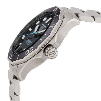 Silver-tone stainless steel case and bracelet. Uni-directional rotating black ceramic bezel. Black dial with silver-tone hands and batons hour markers. Minute markers around the outer rim. Dial Type: Analog. Luminescent hands and markers. Date display at the 6 o'clock position. Automatic movement with an 80-hour power reserve. Scratch resistant sapphire crystal. Screw down crown. Solid case back. Round case shape, case size: 42 mm. Fold over clasp with a safety release. Water resistant at 300 meters / 1000 feet. Functions: date, hour, minute, second. Aquaracer Series. Sport watch style. Watch label: Swiss Made. Tag Heuer Aquaracer Automatic Black Dial Men's Watch WBP5110.BA0013.