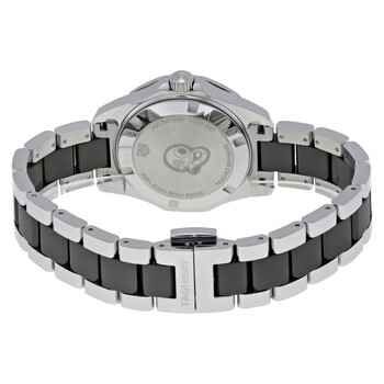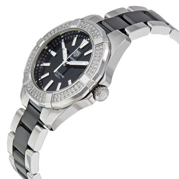 Stainless steel case with a stainless steel bracelet with black ceramic center links. Uni-directional rotating stainless steel bezel set with diamonds. Black dial with luminous silver-tone hands and index hour markers. Minute markers around the outer rim. Dial Type: Analog. Luminescent hands and markers. Date display at the 3 o'clock position. Quartz movement. Scratch resistant sapphire crystal. Screw down crown. Solid case back. Case size: 35 mm. Dodecagon case shape. Bracelet width: 20 mm. Deployment clasp. Water resistant at 300 meters / 1000 feet. Functions: date, hour, minute, second. Luxury watch style. Watch label: Swiss Made. Tag Heuer Aquaracer Black Dial Ladies Watch WAY131E.BA0913.