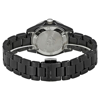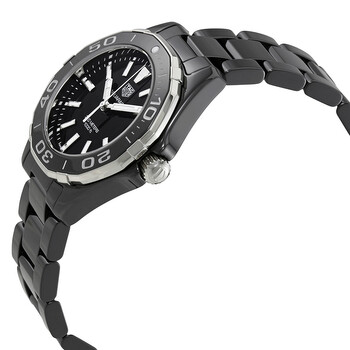 Black ceramic case with a black ceramic bracelet. Uni-directional rotating stainless steel bezel with a black ceramic top ring. Black dial with luminous silver-tone hands and index hour markers. Minute markers around the outer rim. Dial Type: Analog. Luminescent hands and markers. Date display at the 3 o'clock position. Quartz movement. Scratch resistant sapphire crystal. Screw down crown. Solid case back. Dodecagon case shape. Case size: 35 mm. Case thickness: 11 mm. Band width: 20 mm. Deployment clasp with a push button release. Water resistant at 300 meters / 1000 feet. Functions: date, hour, minute, second. Additional Info: suitable for professional marine activity serious surface water sports and skin diving. Luxury watch style. Watch label: Swiss Made. Tag Heuer Aquaracer Black Dial Ladies Watch WAY1390.BH0716.