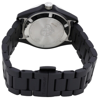 Black ceramic case with a black ceramic bracelet. Uni-directional rotating silver-tone bezel with a black ceramic top ring. Black dial with silver-tone hands and diamond hour markers. Minute markers around the outer rim. Dial Type: Analog. Luminescent hands. Date display at the 3 o'clock position. Quartz movement. Scratch resistant sapphire crystal. Screw down crown. Solid case back. Case size: 35 mm. Dodecagon case shape. Deployment clasp. Water resistant at 300 meters / 1000 feet. Functions: date, hour, minute, second. Luxury watch style. Watch label: Swiss Made. Tag Heuer Aquaracer Black Diamond Dial Ladies Watch WAY1397.BH0743.