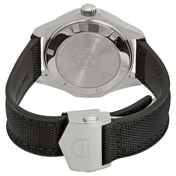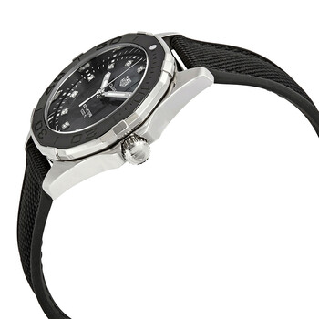Stainless steel case with a black rubber strap with a black textile inlay. Uni-directional rotating stainless steel bezel with a black ceramic inlay. Black mother of pearl dial with luminous silver-tone hands and diamond hour markers. Minute markers around the outer rim. Dial Type: Analog. Luminescent hands. Date display at the 3 o'clock position. Quartz movement. Scratch resistant sapphire crystal. Screw down crown. Solid case back. Dodecagon case shape. Case size: 35 mm. Band width: 17 mm. Fold over clasp with a push button release. Water resistant at 300 meters / 1000 feet. Functions: date, hour, minute, second. Aquaracer Series. Casual watch style. Watch label: Swiss Made. Tag Heuer Aquaracer Black Mother of Pearl Diamond Dial Ladies Watch WAY131M.FT6092.