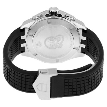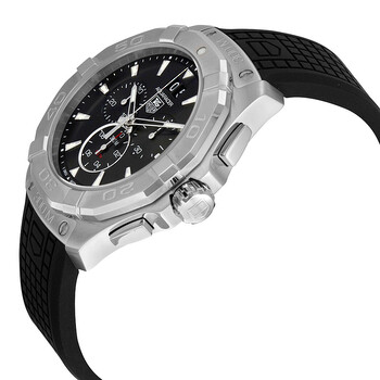 Stainless steel case with a black rubber strap. Uni-directional rotating stainless steel bezel. Black dial with silver-tone skeleton hands and index hour markers. Minute markers around the outer rim. Dial Type: Analog. Luminescent hands and markers. Date display at the 12 o'clock position. Chronograph - three sub-dials displaying: 60 second, 30 minute and 1/10th of a second. Quartz movement. Scratch resistant sapphire crystal. Screw down crown. Solid case back. Case size: 43 mm. Dodecagon case shape. Slip through clasp. Water resistant at 300 meters / 1000 feet. Functions: chronograph, date, hour, minute, second, eol indicator. Sport watch style. Watch label: Swiss Made. Item Variations: CAY1110 FT6041, CAY1110-FT6041, CAY1110/FT6041, CAY1110FT6041. Tag Heuer Aquaracer Chronograph Black Dial Men's Watch CAY1110.FT6041.
