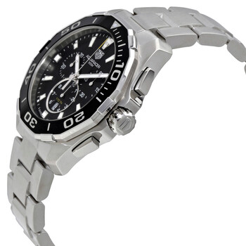 Stainless steel case with a stainless steel bracelet. Uni-directional rotating stainless steel bezel with an inlaid black aluminium ring. Black dial with luminous silver-tone hands and index hour markers. Minute markers around the outer rim. Dial Type: Analog. Luminescent hands and markers. Date display at the 6 o'clock position. Chronograph - three sub-dials displaying: 60 second, 30 minute and 1/10th of a second. Quartz movement. Scratch resistant sapphire crystal. Screw down crown. Solid case back. Case size: 43 mm. Case thickness: 15 mm. Dodecagon case shape. Strap width: 20 mm. Fold over clasp with a safety release. Water resistant at 300 meters / 1000 feet. Casual watch style. Tag Heuer Aquaracer Chronograph Black Dial Men's Watch CAY111A.BA0927.