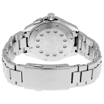 Stainless steel case with a stainless steel bracelet. Uni-directional rotating stainless steel bezel. Silver opaline dial with luminous silver-tone hands and index hour markers. Minute markers around the outer rim. Dial Type: Analog. Luminescent hands and markers. Date display at the 6 o'clock position. Two sub-dials displaying: 60 second and 12 hours (alarm). Quartz movement. Scratch resistant sapphire crystal. Screw down crown. Solid case back. Case size: 40.5 mm. Case thickness: 11.5 mm. Dodecagon case shape. Band width: 20 mm. Band length: 8 inches. Fold over clasp with a push button release. Water resistant at 300 meters / 3300 feet. Functions: chronograph, date, hour, minute, second. Dress watch style. Watch label: Swiss Made. Tag Heuer Aquaracer Chronograph Silver Dial Men's Watch WAY111Y.BA0928.