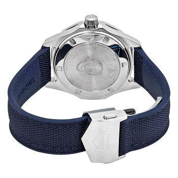 Stainless steel case with a blue textile (rubber backed) strap. Uni-directional rotating stainless steel bezel set with diamonds. Blue mother of pearl dial with luminous silver-tone hands and index hour markers. Minute markers around the outer rim. Dial Type: Analog. Luminescent hands and markers. Date display at the 3 o'clock position. Quartz movement. Scratch resistant sapphire crystal. Screw down crown. Solid case back. Dodecagon case shape. Case size: 35 mm. Folding clasp. Water resistant at 300 meters / 1000 feet. Functions: date, hour, minute, second. Additional Info: 35 diamond set on bezel (0.61 ct). Dive watch style. Watch label: Swiss Made. Tag Heuer Aquaracer Diamond Blue Mother of Pearl Dial Ladies Watch WAY131N.FT6091.