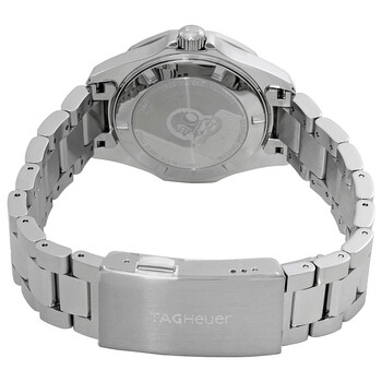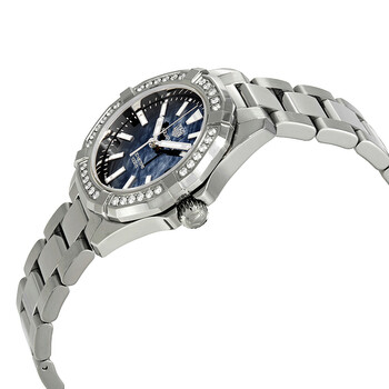 Stainless steel case with a stainless steel bracelet. Uni-directional rotating stainless steel bezel set with 35 diamonds. Blue mother of pearl dial with luminous silver-tone hands and index hour markers. Minute markers around the outer rim. Dial Type: Analog. Luminescent hands and markers. Date display at the 3 o'clock position. Quartz movement. Scratch resistant sapphire crystal. Screw down crown. Solid case back. Dodecagon case shape. Case size: 35 mm. Case thickness: 9.5 mm. Bracelet width: 20 mm. Fold over clasp with a safety release. Water resistant at 300 meters / 1000 feet. Functions: date, hour, minute, second. Additional Info: bezel set with 35 diamonds (0.61 ct). Dress watch style. Watch label: Swiss Made. Tag Heuer Aquaracer Diamond Ladies Watch WAY131N.BA0748.