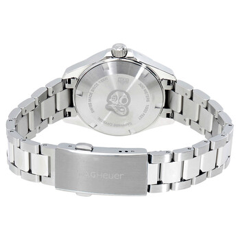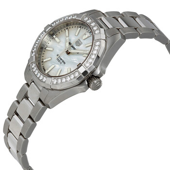 Stainless steel case with a stainless steel bracelet. Uni-directional rotating stainless steel bezel set with 35 diamonds. White mother of pearl dial with luminous silver-tone hands and index hour markers. Minute markers around the outer rim. Dial Type: Analog. Luminescent hands and markers. Date display at the 3 o'clock position. Battery operated quartz movement. Scratch resistant sapphire crystal. Screw down crown. Solid case back. Dodecagon case shape. Case size: 32 mm. Case thickness: 9.5 mm. Fold over clasp with a push button release. Water resistant at 300 meters / 1000 feet. Functions: date, hour, minute, second. Additional Info: bezel set with 35 diamonds (0.61 ct). Dress watch style. Watch label: Swiss Made. Tag Heuer Aquaracer Diamond Ladies Watch WBD1313.BA0740.