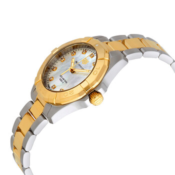 Stainless steel case with a stainless steel bracelet with 18kt yellow gold center links. Uni-directional rotating 18kt yellow gold bezel. White mother of pearl dial with luminous yellow gold-tone hands and diamond hour markers. Minute markers around the outer rim. Dial Type: Analog. Luminescent hands. Date display at the 3 o'clock position. Quartz movement. Scratch resistant sapphire crystal. Screw down crown. Solid case back. Dodecagon case shape. Case size: 32 mm. Case thickness: 9.5 mm. Band width: 16 mm. Fold over clasp with a push button release. Water resistant at 300 meters / 1000 feet. Functions: date, hour, minute, second. Aquaracer Series. Luxury watch style. Watch label: Swiss Made. Tag Heuer Aquaracer Diamond Ladies Watch WBD1322.BB0320.