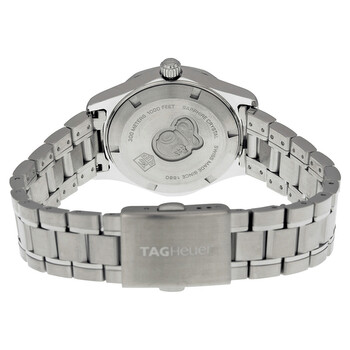 Stainless steel case with a stainless steel bracelet. Unidirectional stainless steel bezel. White mother of pearl dial with silver tone hands and diamond hour markers. Arabic numeral mark the 12 o'clock position. Minute markers around the outer rim. Luminescent hands. Date displays appears at the 3 o'clock position. Swiss quartz movement. Scratch resistant sapphire crystal. Case diameter: 32 mm. Case thickness: 9.5 mm. Deployment clasp. Water resistant at 300 meters / 1000 feet. Functions: hours, minutes, seconds, date. Tag Heuer Aquaracer Ladies Watch WAF1312.BA0817.