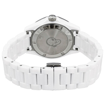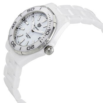 White ceramic case with a white ceramic bracelet. Uni-directional rotating stainless steel bezel with a white ceramic top ring. White dial with luminous silver-tone hands and index hour markers. Minute markers around the outer rim. Dial Type: Analog. Luminescent hands and markers. Date display at the 3 o'clock position. Quartz movement. Scratch resistant sapphire crystal. Screw down crown. Solid case back. Case size: 35 mm. Dodecagon case shape.Bracelet width: 25 mm. Deployment clasp with a push button release. Water resistant at 300 meters / 1000 feet. Functions: date, hour, minute, second. Luxury watch style. Watch label: Swiss Made. Tag Heuer Aquaracer Ladies Watch WAY1391.BH0717.