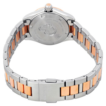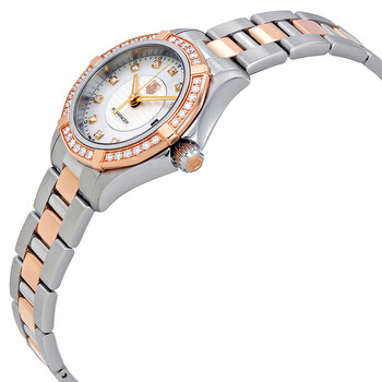 Stainless steel case with a stainless steel bracelet with 18kt rose gold links. Fixed 18kt rose gold bezel. Mother of pearl dial with luminous rose gold hands and diamond hour markers. Minute markers around the outer rim. Dial Type: Analog. Luminescent hands. Date display at the 3 o'clock position. Quartz movement. Scratch resistant sapphire crystal. Screw down crown. Solid case back. Dodecagon case shape. Case size: 27 mm. Band width: 21.6 mm. Band length: 8.5 inches. Fold over with push button safety release clasp. Water resistant at 200 meters / 660 feet. Functions: date, hour, minute, second. Luxury watch style. Watch label: Swiss Made. Item Variations: WAP1452 BD0837, WAP1452-BD0837, WAP1452/BD0837, WAP1452BD0837. Tag Heuer Aquaracer Mother of Pearl Dial Ladies Watch WAP1452.BD0837.
