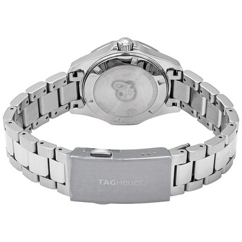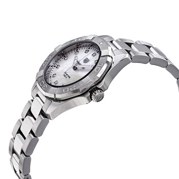 Stainless steel case with a stainless steel bracelet. Uni-directional rotating stainless steel bezel. Mother of pearl dial with luminous rhodium-plated hands and diamond hour markers. Minute markers around the outer rim. Dial Type: Analog. Luminescent hands and markers. Date display at the 3 o'clock position. Quartz movement. Scratch resistant sapphire crystal. Screw down crown. Solid case back. Dodecagon case shape, case size: 35 mm. Fold over clasp with a safety release. Water resistant at 300 meters / 1000 feet. Functions: date, hour, minute, second. Additional Info: 11 diamonds. Aquaracer Series. Dress watch style. Watch label: Swiss Made. Tag Heuer Aquaracer Mother of Pearl Diamond Dial Ladies Watch WBD131B.BA0748.