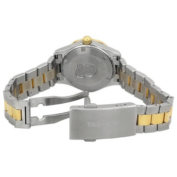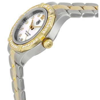 Stainless steel case with a stainless steel bracelet with 18kt yellow gold center links. Unidirectional 18kt yellow gold bezel set with diamonds. White mother of pearl dial with gold-tone hands and diamond hour markers. An Arabic numeral marks the 12 o'clock position. Minute markers around the outer rim. Dial Type: Analog. Luminescent hands. Date display appears at the 3 o'clock position. Quartz movement. Scratch resistant sapphire crystal. Screw down crown. Solid case back. Case diameter: 26 mm. Case thickness: 9 mm. Dodecagon case shape. Band width: 14 mm. Push button deployment clasp. Water resistant at 300 meters / 1000 feet. Functions: date, hour, minute, second. Additional Info: 10 diamonds on the dial.. Sport watch style. Watch label: Swiss Made. TAG Heuer Aquaracer Diamond Set Bi-Metal Bracelet Ladies Watch WAF1450.BB0825.