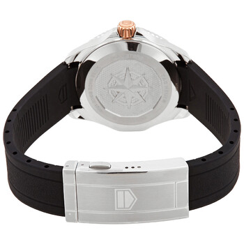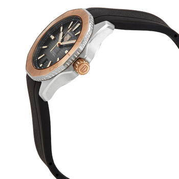 Silver-tone stainless steel case with a black rubber strap. Uni-directional rotating stainless steel and 18kt rose gold bezel. Black dial with rose gold-tone hands and index hour markers. Minute markers around the outer rim. Dial Type: Analog. Luminescent hands and markers. Date display at the 6 o'clock position. TAG Heuer Calibre 5 Automatic movement, based upon ETA 2824-2, containing 26 Jewels, bitting at 28800 vph, and has a power reserve of approximately 38 hours. Scratch resistant sapphire crystal. Screw down crown. Solid case back. Dodecagon case shape, case size: 40 mm. Folding clasp. Water resistant at 200 meters / 660 feet. Functions: date, day, hour, minute, second. Aquaracer Professional 200 Series. Luxury watch style. Watch label: Swiss Made. Tag Heuer Aquaracer Professional 200 Automatic Black Dial Men's Watch WBP2151.FT6199.