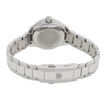 Silver-tone stainless steel case with a blue stainless steel bracelet. Uni-directional rotating silver-tone stainless steel bezel. Red mother of pearl dial with silver-tone hands and diamond hour markers. Minute markers around the outer rim. Dial Type: Analog. Date display at the 6 o'clock position. Tag Heuer Calibre 9 Automatic automatic movement with a 40-hour power reserve. Scratch resistant sapphire crystal. Screw down crown. Solid case back. Round case shape, case size: 30 mm. Folding clasp. Water resistant at 200 meters / 660 feet. Functions: date, hour, minute, second. Aquaracer Professional 200 Series. Dress watch style. Watch label: Swiss Made. Tag Heuer Aquaracer Professional 200 Automatic Diamond Red Dial Ladies Watch WBP2414.BA0622.
