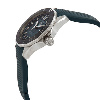 Silver-tone stainless steel case with a blue rubber strap. Uni-directional rotating silver-tone stainless steel bezel with a black ceramic ring. Blue dial with silver-tone hands and diamond-index hour markers. Dial Type: Analog. Luminescent hands and markers. Date display at the 6 o'clock position. TAG Heuer Calibre 5 Automatic movement, based upon ETA 2824-2, containing 26 Jewels, bitting at 28800 vph, and has a power reserve of approximately 38 hours. Scratch resistant sapphire crystal. Screw down crown. Solid case back. Dodecagon case shape, case size: 36 mm. Folding clasp. Water resistant at 300 meters / 1000 feet. Functions: date, hour, minute, second. Aquaracer Professional 300 Date Series. Luxury watch style. Watch label: Swiss Made. Tag Heuer Aquaracer Professional 300 Date Automatic Diamond Blue Dial Ladies Watch WBP231G.FT6226.