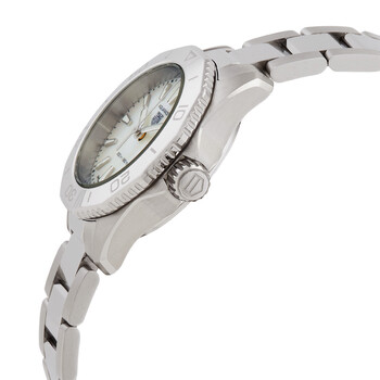 Silver-tone stainless steel case and bracelet. Silver-tone stainless steel bezel. Mother of pearl dial with silver-tone hands and index hour markers. Minute markers around the outer rim. Dial Type: Analog. Luminescent hands and markers. Quartz movement. Scratch resistant sapphire crystal. Screw down crown. Solid case back. Round case shape, case size: 30 mm. Deployment with push button release clasp. Water resistant at 200 meters / 660 feet. Functions: hour, minute, second. Additional Info: original box, international warranty card, manual (complete accessories). Aquaracer Professional Series. Luxury watch style. Watch label: Swiss Made. Tag Heuer Aquaracer Professional Quartz Ladies Watch WBP1418.BA0622.