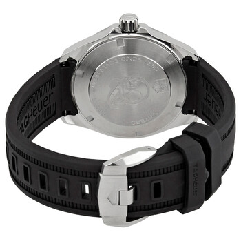 Stainless steel case with a black rubber strap. Uni-directional rotating stainless steel bezel. Silver dial with luminous silver-tone hands and index hour markers. Minute markers around the outer rim. Dial Type: Analog. Luminescent hands and markers. Date display at the 3 o'clock position. Quartz movement. Scratch resistant sapphire crystal. Screw down crown. Solid case back. Dodecagon case shape. Case size: 40.5 mm. Case thickness: 12 mm. Band width: 20 mm. Tang clasp. Water resistant at 300 meters / 1000 feet. Functions: date, hour, minute, second. Aquaracer Series. Dive watch style. Watch label: Swiss Made. Tag Heuer Aquaracer Quartz Silver Dial Men's Watch WAY1111.FT8021.