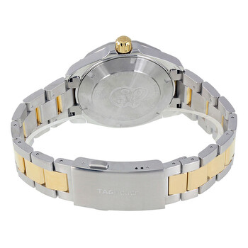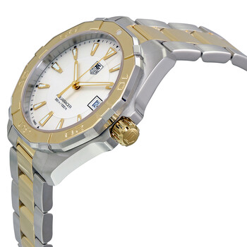 Stainless steel case with a two-tone (silver and yellow gold-plated) stainless steel bracelet. Uni-directional rotating stainless steel bezel with a yellow gold-plated top ring. Silver opaline dial with luminous yellow gold-tone hands and index hour markers. Minute markers around the outer rim. Dial Type: Analog. Luminescent hands and markers. Date display at the 3 o'clock position. Quartz movement. Scratch resistant sapphire crystal. Screw down crown. Solid case back. Case size: 40.5 mm. Case thickness: 12.5 mm. Dodecagon case shape. Band width: 20 mm. Deployment clasp. Water resistant at 300 meters / 1000 feet. Functions: date, hour, minute, second. Additional Info: in general, suitable for mixed-gas diving. Luxury watch style. Watch label: Swiss Made. Tag Heuer Aquaracer Silver Opalin Dial Men's Watch WAY1120.BB0930.