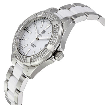 Stainless steel case with a stainless steel bracelet with white ceramic center links. Uni-directional rotating stainless steel bezel set with diamonds. White dial with luminous silver-tone hands and index hour markers. Minute markers around the outer rim. Dial Type: Analog. Luminescent hands and markers. Date display at the 3 o'clock position. Quartz movement. Scratch resistant sapphire crystal. Screw down crown. Solid case back. Dodecagon case shape. Case size: 35 mm. Case thickness: 11 mm. Band width: 15 mm. Fold over clasp with a push button release. Water resistant at 300 meters / 1000 feet. Functions: date, hour, minute, second. Luxury watch style. Watch label: Swiss Made. Tag Heuer Aquaracer White Dial Ladies Watch WAY131F.BA0914.
