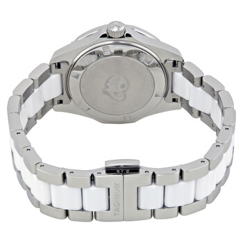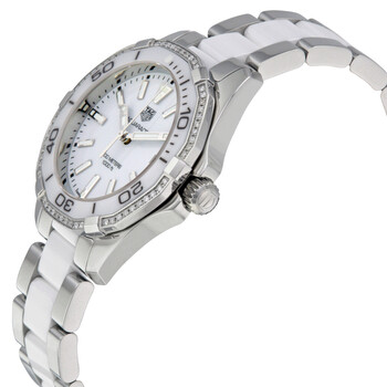 Stainless steel case with a stainless steel bracelet with white ceramic center links. Uni-directional rotating stainless steel bezel with a white ceramic ring and set with diamonds. White dial with luminous silver-tone hands and index hour markers. Minute markers around the outer rim. Dial Type: Analog. Luminescent hands and markers. Date display at the 3 o'clock position. Quartz movement. Scratch resistant sapphire crystal. Screw down crown. Solid case back. Dodecagon case shape. Case size: 35 mm. Case thickness: 12 mm. Band width: 17 mm. Deployment clasp with a push button release. Water resistant at 300 meters / 1000 feet. Functions: date, hour, minute, second. Luxury watch style. Watch label: Swiss Made. Tag Heuer Aquaracer White Dial Ladies Watch WAY131H.BA0914.
