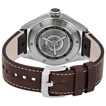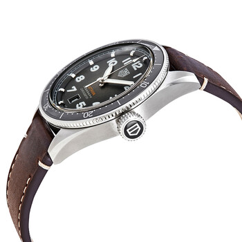 Silver-tone stainless steel case with a brown leather strap. Black bezel. Smokey black dial with silver-tone hands and Arabic numeral hour markers. Minute markers around the outer rim. Dial Type: Analog. Date display at the 6 o'clock position. Automatic movement. Scratch resistant sapphire crystal. Solid case back. Round case shape. Case size: 42 mm. Water resistant at 100 meters / 330 feet. Functions: date, hour, minute, second. Watch label: Swiss Made. Tag Heuer Autavia Automatic Men's Watch WBE5110.FC6266.