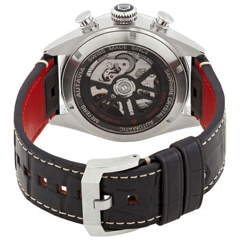 Silver-tone stainless steel case with a black alligator band. Black ceramic bezel. Black dial with silver-tone hands and Arabic numeral hour markers. Minute markers around the outer rim. Dial Type: Analog. Luminescent hands and markers. Date display at the 6 o'clock position. Chronograph - three sub-dials displaying: 60 second, 30 minute and 12 hour. Tag Heuer Calibre 02 Automatic movement, containing 33 Jewels, composed of 168 parts, bitting at 28800 vph, and has a power reserve of approximately 80 hours. Scratch resistant sapphire crystal. Screw down crown. Transparent see through case back. Round case shape, case size: 42 mm. Buckle clasp. Water resistant at 100 meters / 330 feet. Functions: chronograph, column wheel, date, hour, minute, small second. Additional Info: original box, international warranty card, manual (complete accessories). Autavia Series. Luxury watch style. Watch label: Swiss Made. Tag Heuer Autavia Chronograph Automatic Black Dial Men's Watch CBE511A-FC8279.
