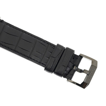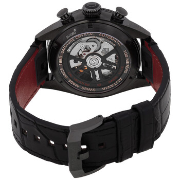 Black PVD stainless steel case with a black alligator leather strap. Black PVD ceramic bezel. Black dial with silver-tone hands and Arabic numeral hour markers. Minute markers around the outer rim. Dial Type: Analog. Luminescent hands and markers. Date display at the 6 o'clock position. Chronograph - three sub-dials displaying: 60 second, 30 minute and 12 hour. Tag Heuer Calibre 02 Automatic movement, containing 33 Jewels, composed of 168 parts, bitting at 28800 vph, and has a power reserve of approximately 80 hours. Scratch resistant sapphire crystal. Screw down crown. Transparent case back. Round case shape, case size: 42 mm, case thickness: 15.68 mm. Band width: 21 mm. Tang clasp. Water resistant at 100 meters / 330 feet. Functions: chronograph, column wheel, date, hour, minute, small second. Autavia Series. Luxury watch style. Watch label: Swiss Made. Tag Heuer Autavia Chronograph Automatic Black Dial Men's Watch CBE511C.FC8280.