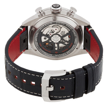 Silver-tone stainless steel case with a black alligator leather strap. Black ceramic bezel. Silver dial with silver-tone hands and Arabic numeral hour markers. Minute markers around the outer rim. Dial Type: Analog. Luminescent hands and markers. Date display at the 6 o'clock position. Chronograph - three sub-dials displaying: 60 second, 60 minute and 12 hour. Heuer02 COSC Flyback automatic movement with an 80-hour power reserve. Scratch resistant sapphire crystal. Screw down crown. Transparent see through case back. Round case shape, case size: 42 mm, case thickness: 15.68 mm. Band width: 21 mm. Tang clasp. Water resistant at 100 meters / 330 feet. Functions: chronograph, date, hour, minute, second. Autavia Chronometer Flyback Series. Watch label: Swiss Made. Tag Heuer Autavia Chronometer Flyback Chronograph Automatic Silver Dial Men's Watch CBE511B.FC8279.