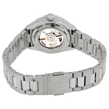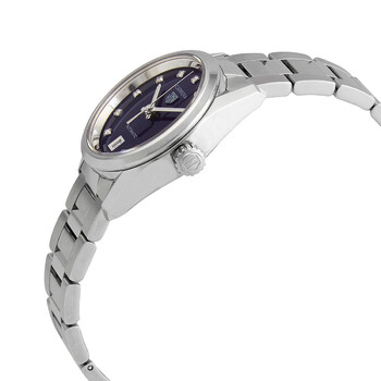 Stainless steel case with a stainless steel bracelet. Fixed stainless steel bezel. Blue dial with luminous silver-tone hands and diamond hour markers. Dial Type: Analog. Luminescent hands. Date display at the 6 o'clock position. Calibre 9 automatic movement with a 40-hour power reserve. Scratch resistant sapphire crystal. Pull / push crown. Transparent case back. Round case shape. Case diameter: 29 mm. Case thickness: 10.75 mm. Band width: 15 mm. Fold over clasp with a safety release. Water resistant at 100 meters / 330 feet. Functions: date, hour, minute, second. Dress watch style. Watch label: Swiss Made. Tag Heuer Automatic Diamond Blue Dial Ladies Watch WBN2413.BA0621.