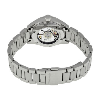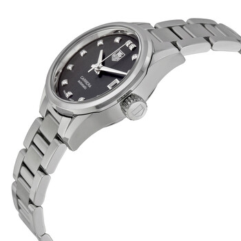 Stainless steel case with a stainless steel bracelet. Fixed stainless steel bezel. Black dial with silver-tone hands and diamond hour markers. Dial Type: Analog. Date display at the 3 o'clock position. Automatic movement with a 40 hour power reserve. Scratch resistant sapphire crystal. Pull / push crown. Skeleton case back. Case diameter: 28 mm. Case thickness: 11 mm. Round case shape. Band width: 14 mm. Band length: 7 inches. Deployment clasp with a push button release. Water resistant at 100 meters / 330 feet. Functions: date, hour, minute, second. Dress watch style. Watch label: Swiss Made. Tag Heuer Carrera Automatic Black Dial Ladies Watch WAR2413.BA0776.