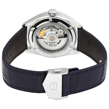 Silver-tone stainless steel case with a blue leather (alligator) strap. bezel: Fixed silver-tone stainless steel . Blue dial with luminous silver-tone hands and index hour markers. Arabic numeral minute markers (at 10 minute intervals). Minute markers around the outer rim. Dial Type: Analog. Luminescent hands and markers. Date display at the 6 o'clock position. Tag Heuer Calibre 5 Automatic automatic movement with a 38-hour power reserve. Scratch resistant sapphire crystal. Transparent case back. Round case shape, case size: 39 mm, case thickness: 11.50 mm. Folding clasp. Water resistant at 100 meters / 330 feet. Functions: date, hour, minute, second. Carrera Series. Luxury watch style. Watch label: Swiss Made. Tag Heuer Carrera Automatic Blue Dial Men's Watch WBN2112.FC6504.