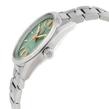 Silver-tone stainless steel case and bracelet. Fixed silver-tone stainless steel bezel. Green dial with rose gold-tone hands and index hour markers. Minute markers around the outer rim. Dial Type: Analog. Luminescent hands and markers. Date display at the 6 o'clock position. Tag Heuer Calibre 7 Automatic movement, based upon ETA 2892-A2, containing 25 Jewels, bitting at 28800 vph. Scratch resistant sapphire crystal. Transparent see through case back. Round case shape, case size: 36 mm. Deployment with push button release clasp. Water resistant at 50 meters / 165 feet. Functions: date, hour, minute, second. Additional Info: original box, manual (complete accessories). Carrera Series. Luxury watch style. Watch label: Swiss Made. Tag Heuer Carrera Automatic Green Dial Unisex Watch WBN2312.BA0001.